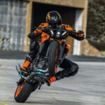 Aspectul exterior a mers pe ideea ”electric orange”, în amintirea modelului KTM 990 Super Duke din 2005. Propulsorul este folosit ca element de rezistență în cadrul său de oțel vopsit electrostatic. Pe partea de suspensie, avem o furcă față WP Apex de 43 mm cu compresia și detenta reglabilă, în timp ce bascula spate are un monoamortizor preîncărcare și detentă reglabile. Trenul de rulare include jante de 17 inchi din aluminiu turnat echipate cu anvelope Bridgestone S22.