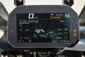În mers, cu mici excepții, dacă este prezent pachetul opțional Dinamic (720 euro) cu al său quick shifter, ambreiajului rămâne pe post de decor, atât la schimbări în sus cât și-n jos. Dinamic aduce cu el vin modurile de condus Dynamic și Enduro, pe lângă cele standard Rain și Road, iar ASC-ul (controlul automat al stabilității) și ABS-ul devin DTC și ABS Pro (cornering). Ciclistica este atât de bună încât ți se pare că o conduci deja de ceva vreme. Manevrele la vitezele mică sunt doar o formalitate datorită masei bine distribuite, iar pornirile de croșetare a traficului pare că îți sunt încurajate.