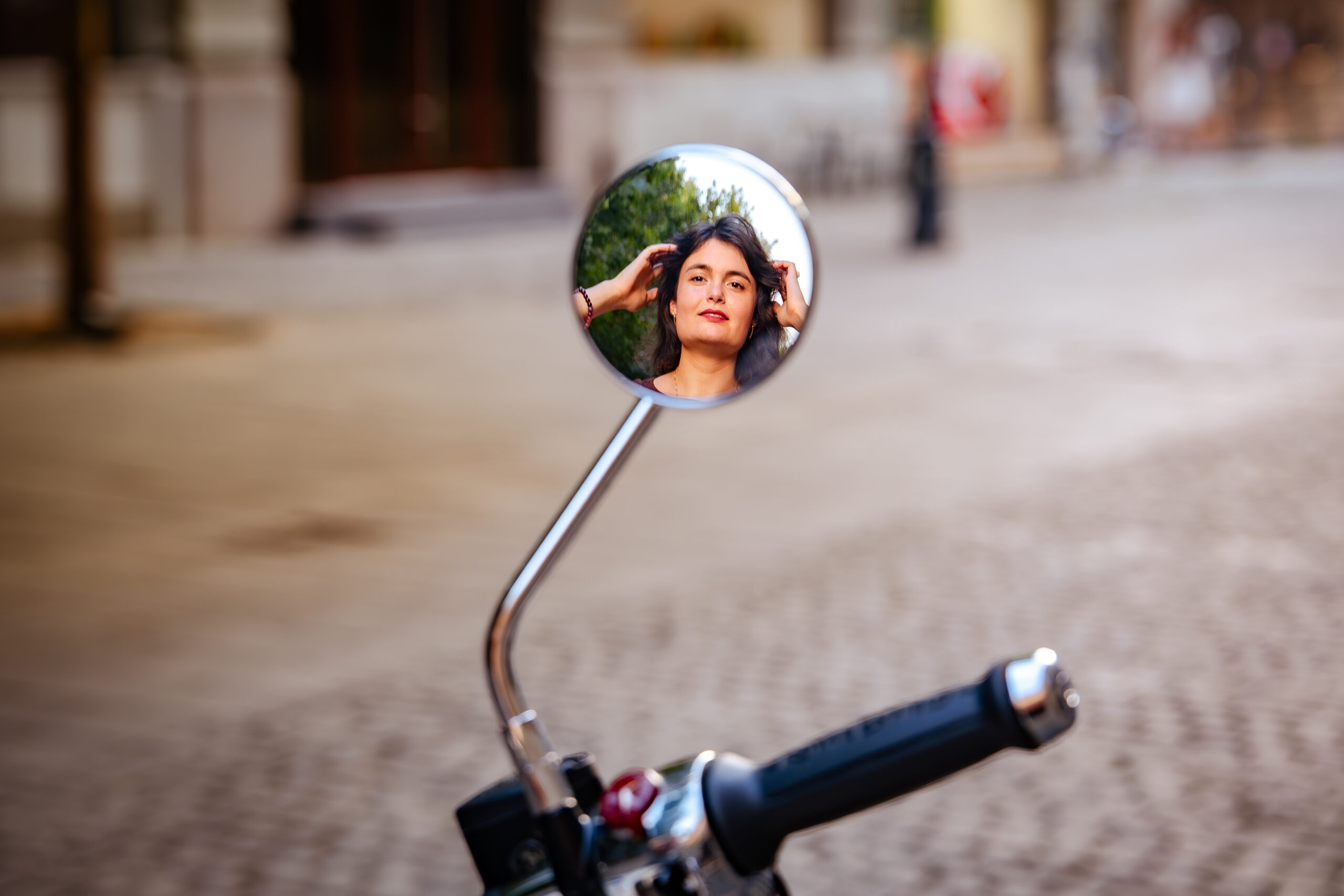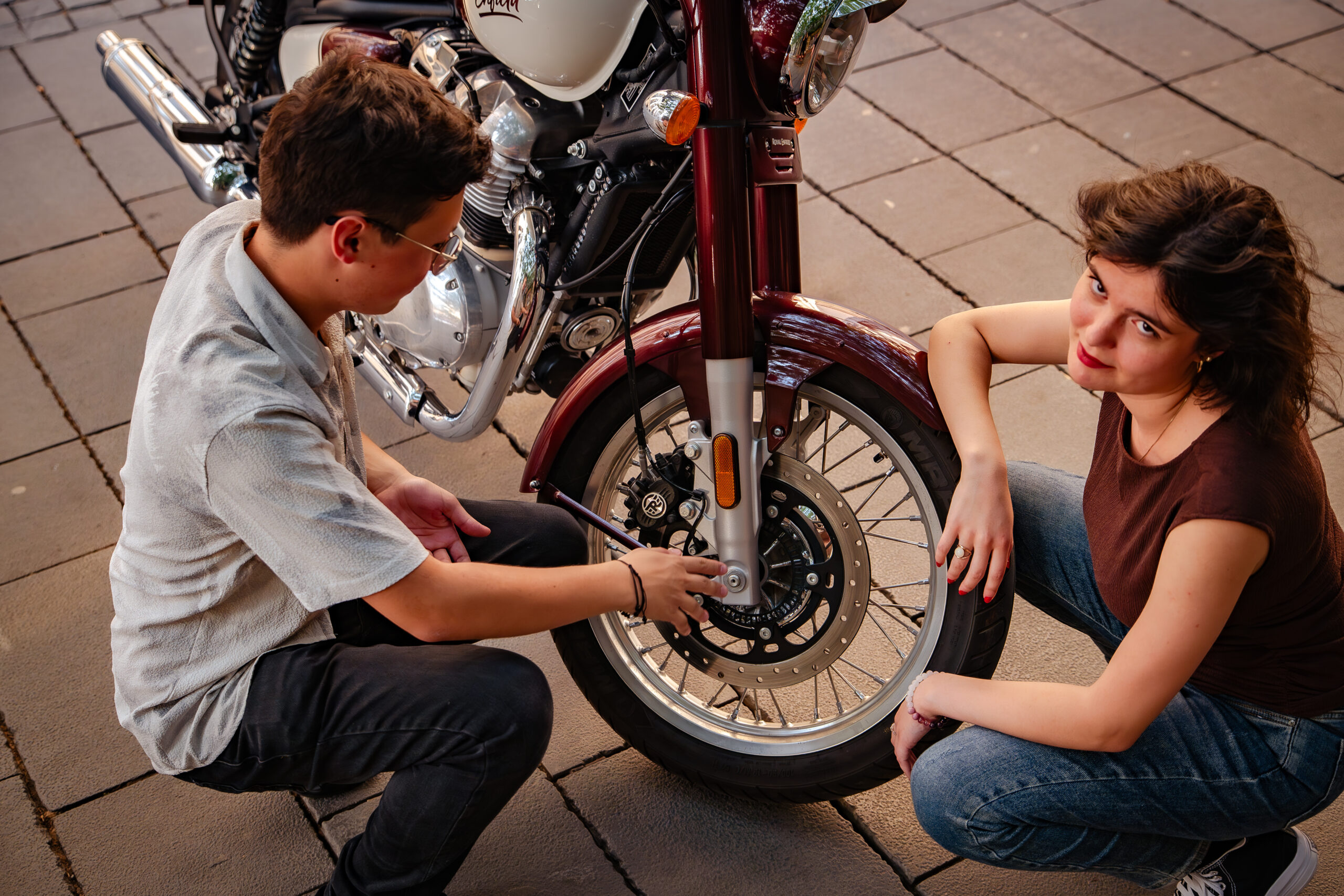 El: Înălțimea la șa e de 800 mm, așa că-i potrivită pentru amândoi. Cadrul este din oțel, de acolo și greutatea de 243 kg la plin, dar nu-ți face griji, nu vei avea probleme printre mașini, e foarte bine echilibrată. Trebuie doar să fii atentă la scărițele late.