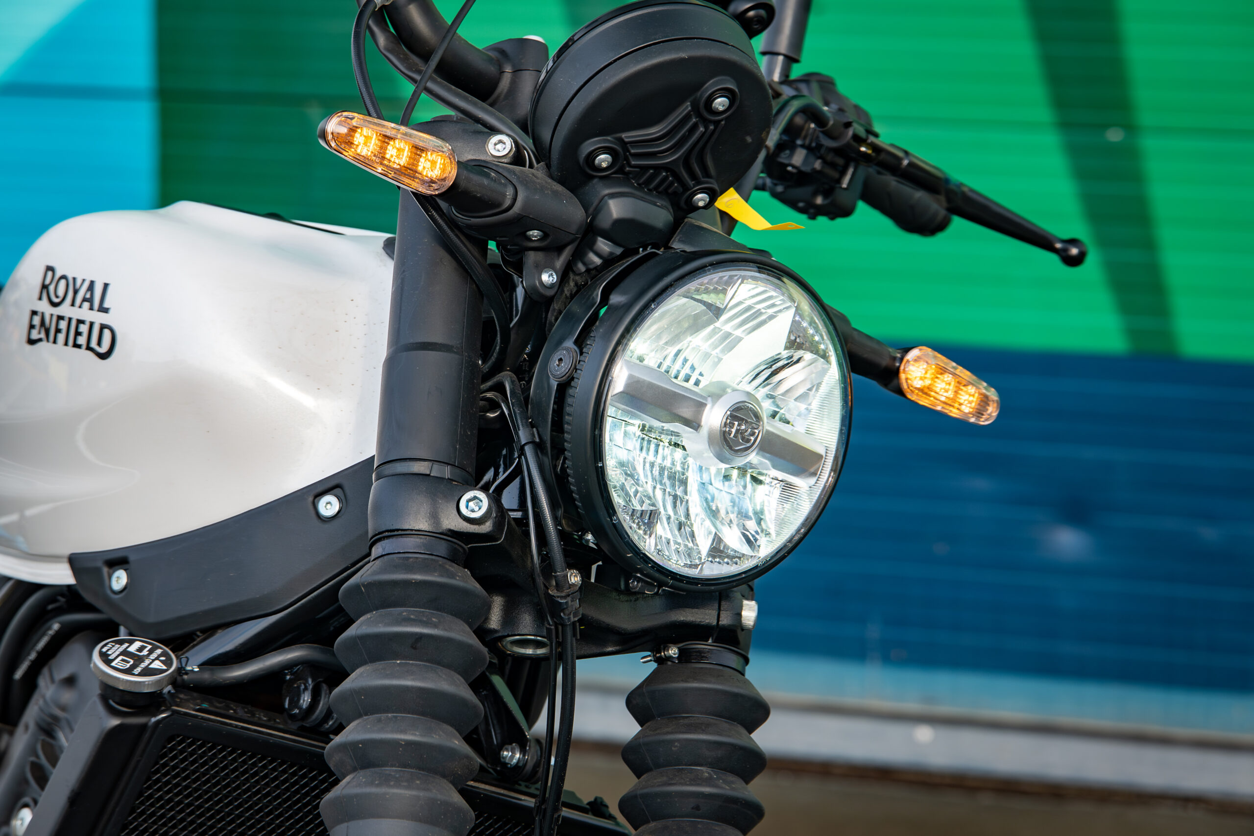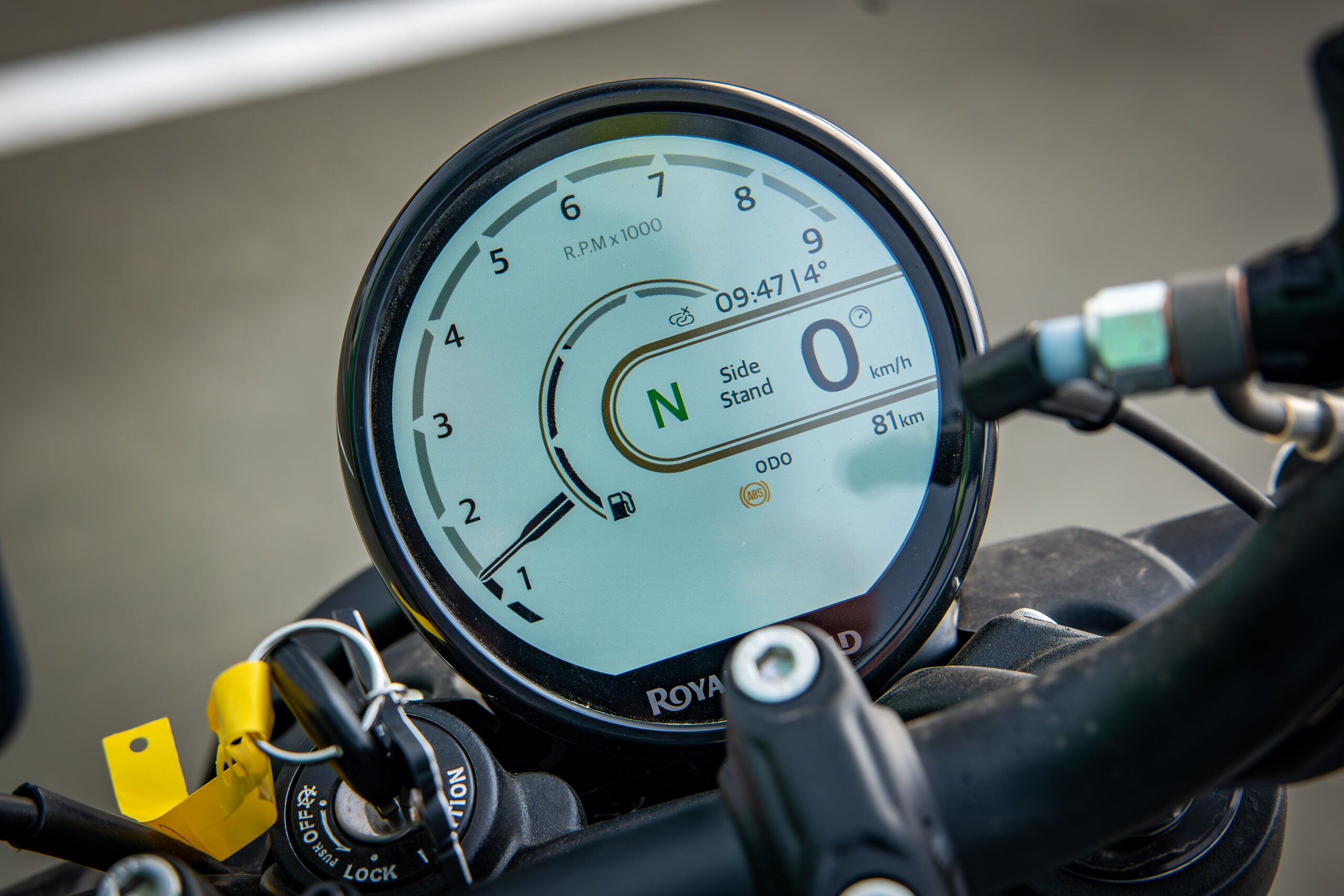 Prima dată când m-am urcat pe motocicleta asta, am avut același șoc ca la Himalayan: E un altfel de Royal Enfield. Vorbim despre dotări care se aliniază perfect pieței, în centrul atenției fiind ecranul TFT cu navigație Google Maps integrată, care funcționează cu aplicația Royal Enfield, dar și faptul că avem ride-by-wire, care aduce implicit și două moduri de condus, Eco și Performance. Comenzile de pe ghidon sunt cele caracteristice Royal Enfield și nu par deloc ieftine. De asemenea, pe ghidon există și o priză tip C pentru încărcarea telefonului.