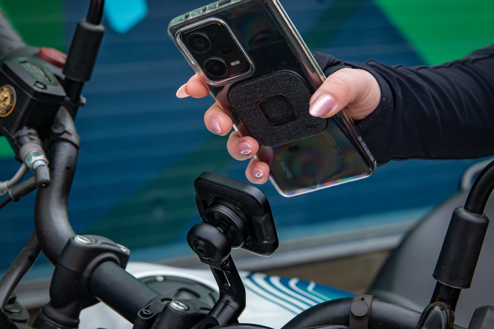 Acesta a fost motivul pentru care m-am bucurat când cei de la Peakdesign m-au invitat să le testez produsul. Am fost încântat de când am deschis cutia și am văzut cât de subțire este adaptorul universal care se lipește pe husa telefonului. Există și huse dedicate, însă doar pentru telefoane Apple, Samsung și Google Pixel. Sistemul de montare Peak Design e magnetic, dar numai pentru a ajuta la poziționarea telefonului (și pentru încărcarea Magsafe sau pentru suporturile lor de mașină), iar cele două cleme mici de pe suport prind incredibil de bine inserția ceramică subțire din spatele carcasei telefonului. Niciun impact sau chiar tragere nu eliberează telefonul de pe suportul său până la apăsarea unuia dintre butoane. Există două butoane pe suporturile Peak Design, dar trebuie să apeși doar unul pentru ca ambele cleme să se retragă în corpul suportului și să-ți permită să ridici telefonul de pe baza magnetică. Fiindcă trebuie să apeși doar un buton, suportul este foarte ușor de folosit chiar și cu mânuși moto. În cutia suportului primești și trei adaptoare de cauciuc care te ajută la montarea pe orice tip de ghidon, iar pentru motocicletele cu semighidoane există și monturi pentru furcă, oglinzi sau frâne.