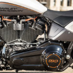 Felul în care merge această FXDR. Nu te plimbă de colo, colo, te mișcă pur și simplu. Și totul începe de la cum e construită. Un cadru rigid de oțel fixează motorul cu suporți care-i ascund parțial vibrațiile. Sentimentul pe care îl transmite este unul personal în cazul meu, dar ușor de recunoscut: pare un Mercedes-Benz din anii ‘80 (am avut vreo trei, din generații diferite). Rafinament amestecat cu o robustețe ce-ți spune că poți face înconjurul lumii dacă vrei neapărat. Și nu lipsește agilitatea. Aici furca și bascula de aluminiu ajută la păstrarea unei greutăți reduse, masa totală depășind puțin pragul de 300 kg la plin.