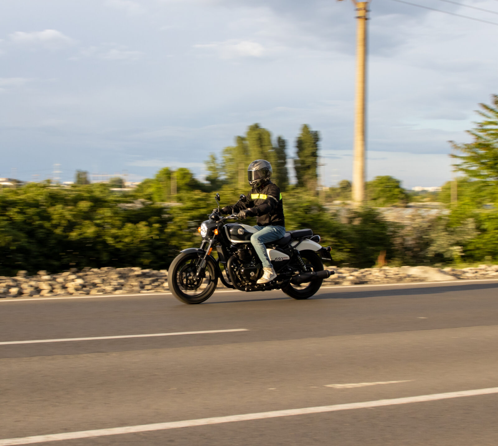 Acum am ascultat suficient și, în sfârșit, scoatem motocicleta pe stradă. Surpriză: Deși cântărește 240 de kilograme, Shotgun 650 nu este deloc leneșă. Acest lucru se datorează cu siguranță și anvelopelor, care sunt destul de înguste pentru un cruiser. În față este montată o anvelopă 100/90 (producător: Ceat din India), iar în spate o anvelopă 150/70. Alegerea anvelopelor este foarte reușită, cauciucul se armonizează foarte bine cu motocicleta. Ar fi exagerat să numim Shotgun o motocicletă perfectă pentru viraje, dar este de fapt foarte ușor de condus și, prin urmare, o motocicletă accesibilă, potrivită și pentru începători. În ciuda greutății sale de 240 kg, Shotgun 650 are doar un singur disc în față. Cu toate acestea, cu un diametru de 320 mm, acesta este destul de generos dimensionat. Acest lucru este valabil și mai mult pentru discul din spate: 300 mm pe roata din spate este rar întâlnit. Etrierii plutitori cu două pistoane de la Bybre funcționează în față și în spate. Motocicleta decelera exemplar, deși trebuie să tragi puțin de maneta din față dacă vrei sau trebuie să frânezi puternic. Pe de altă parte, în spate, este suficientă o presiune ușoară pe pedala de frână pentru ca frânele să reacționeze. Dacă apeși puțin mai tare, ABS-ul intră rapid în acțiune – nu e de mirare cu dimensiunea discului!